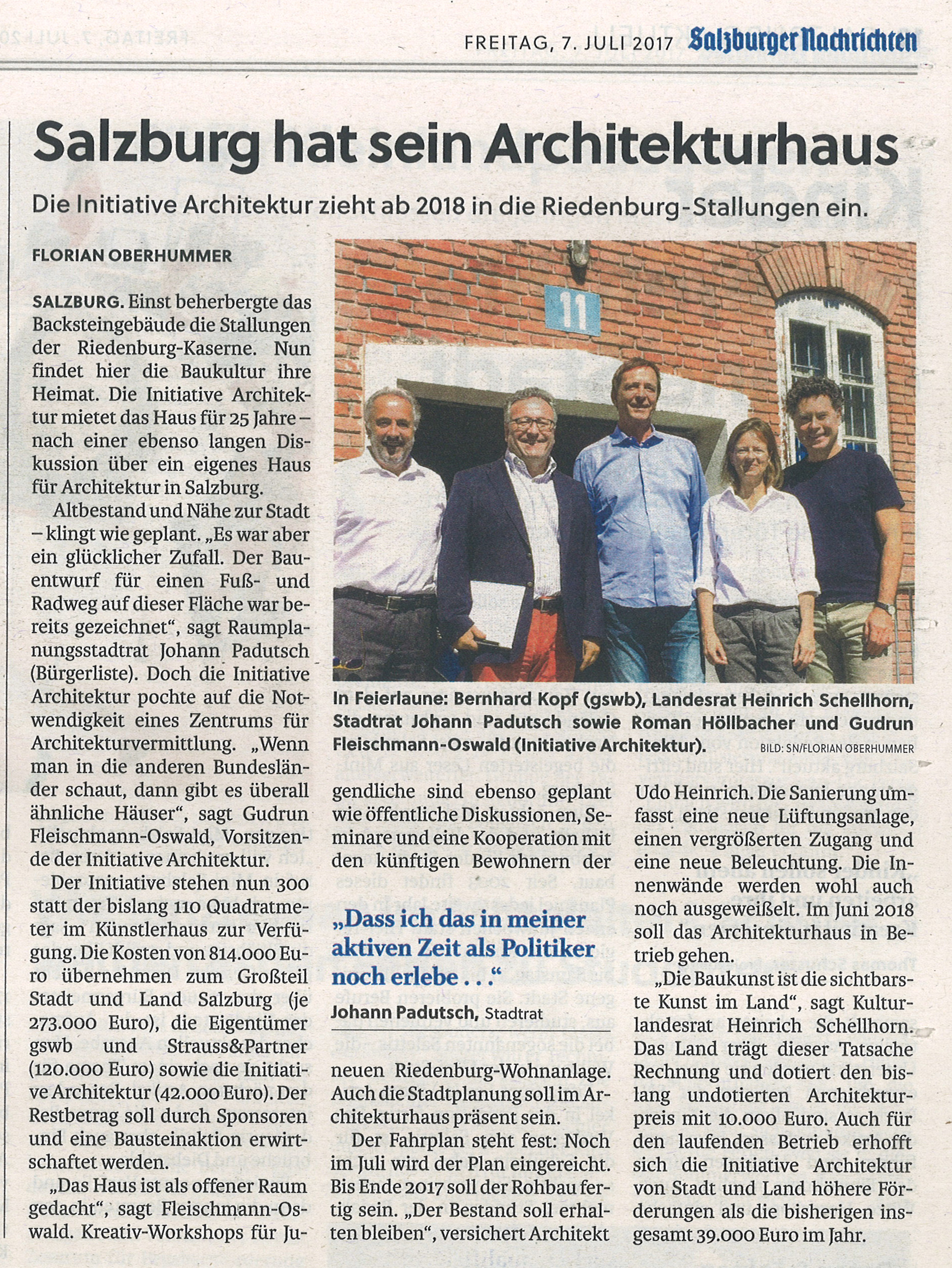 INFORMATIONSGESPRÄCHAm 6. Juli 2017 fand ein erstes Informationsgespräch zum geplanten Architekturhaus Salzburg im neuen Haus in der Riedenburg statt. Angesiedelt auf dem Areal der ehemaligen Riedenburgkaserne, wird das rund 300 qm große Backsteingebäude, derzeit für seine zukünftige Nutzung adaptiert. Als Haus für die Vermittlung von Themen der Architektur und Baukultur konzipiert, sind sowohl Ausstellungsflächen, als auch Räume für Seminare und Vorträge, in der Planung vorgesehen. Gedacht als offener Ort, lädt die Initiative Architektur bewusst Gruppen aus diesem Bereich, zur Nutzung der neuen Räume ein.