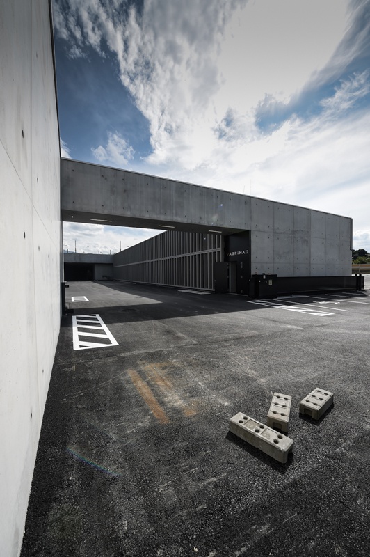 Von der neuen Autobahnmeisterei bei Salzburg-Mitte sind von außen nur die 25 Meter hohen Türme der Salzsilos zu sehen. Im Inneren bestimmt das Spiel der Materialien Glas, Beton und Aluminium den Charakter der vier, um einen Innenhof angeordneten Baukörper.