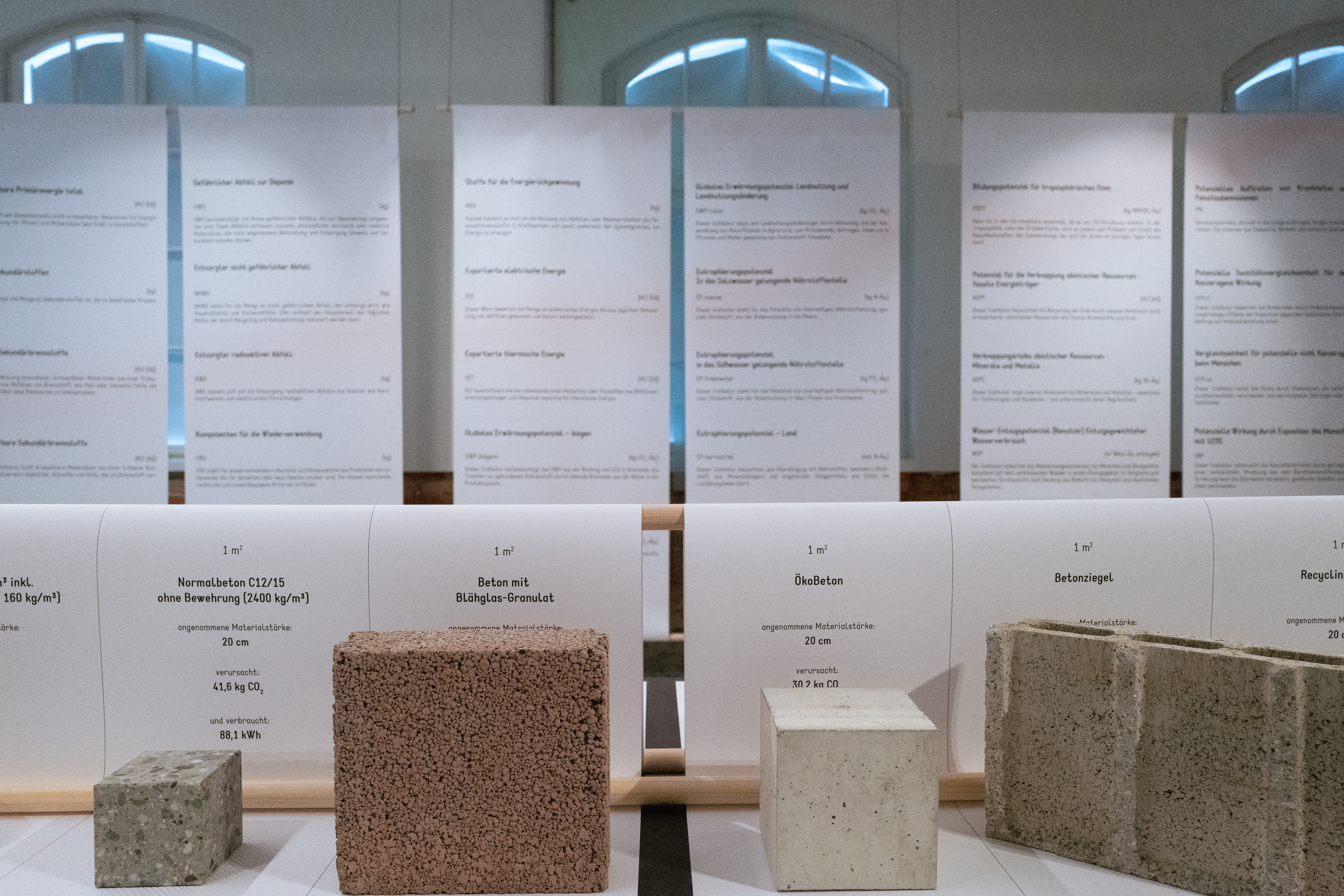Neben einem erklärenden Ampelsystem und Begriff-Erläuterungen zu Grauer Energie, Primärenergie, Primärenergiegehalt und Global Warming Potential (GWP) zeigt die Ausstellung alle relevanten Ökoindikatoren auf. Datenbasis ist im Wesentlichen die Baubook-Datenbank, eine öffentlich zugängliche Datenbank zu Baustoffen für energieeffizientes und nachhaltiges Bauen. Ergänzt wird die Materialsammlung mit beispielhaften Projekten, die je für die Bereiche Neubau, Holzbau und Umbauten maßgeblich sind, unter anderem in der Reduktion der klimaschädlichen Emissionen, effizienten Energiegewinnung und Flächenrecycling.